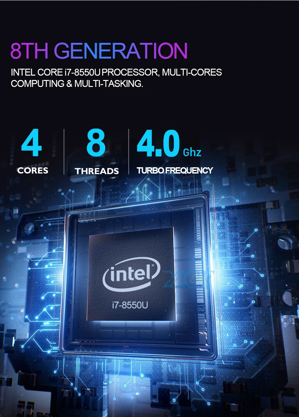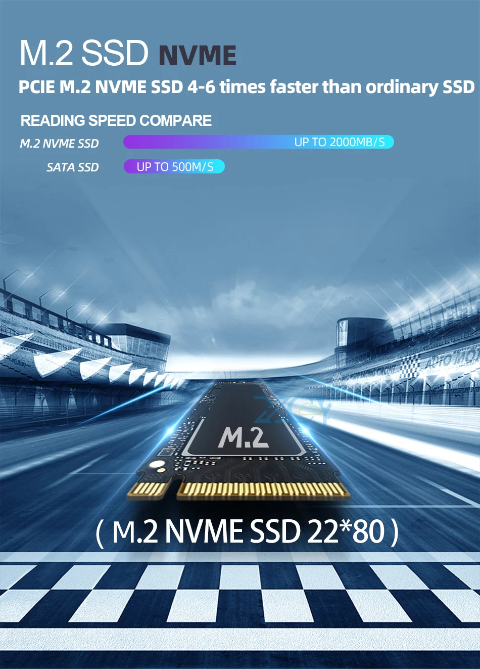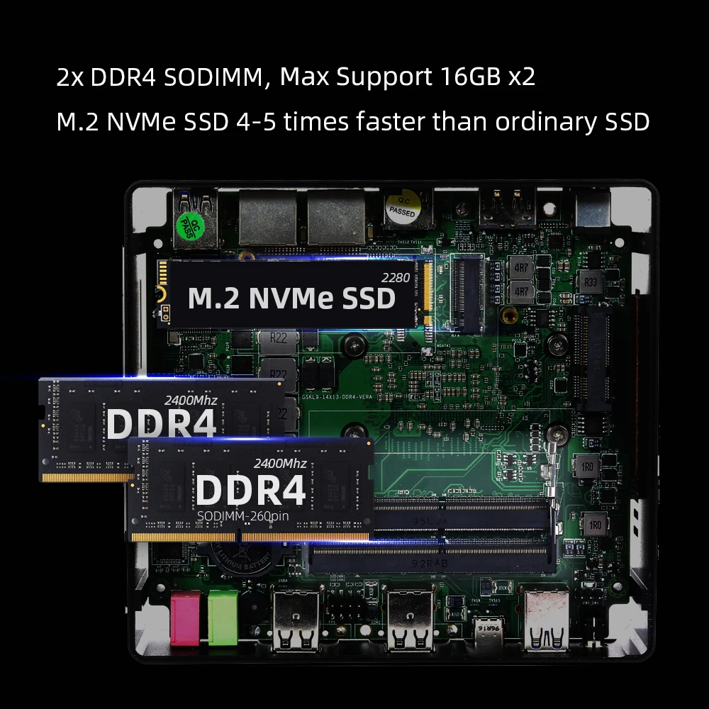 Compatible with SODIMM 260pins DDR4 2400/2666Mhz, two memory slots, each memory slot max support to 16GB, total support to 32GB RAM;1x M.2 NVMe2280 SSD hard drive slot;
