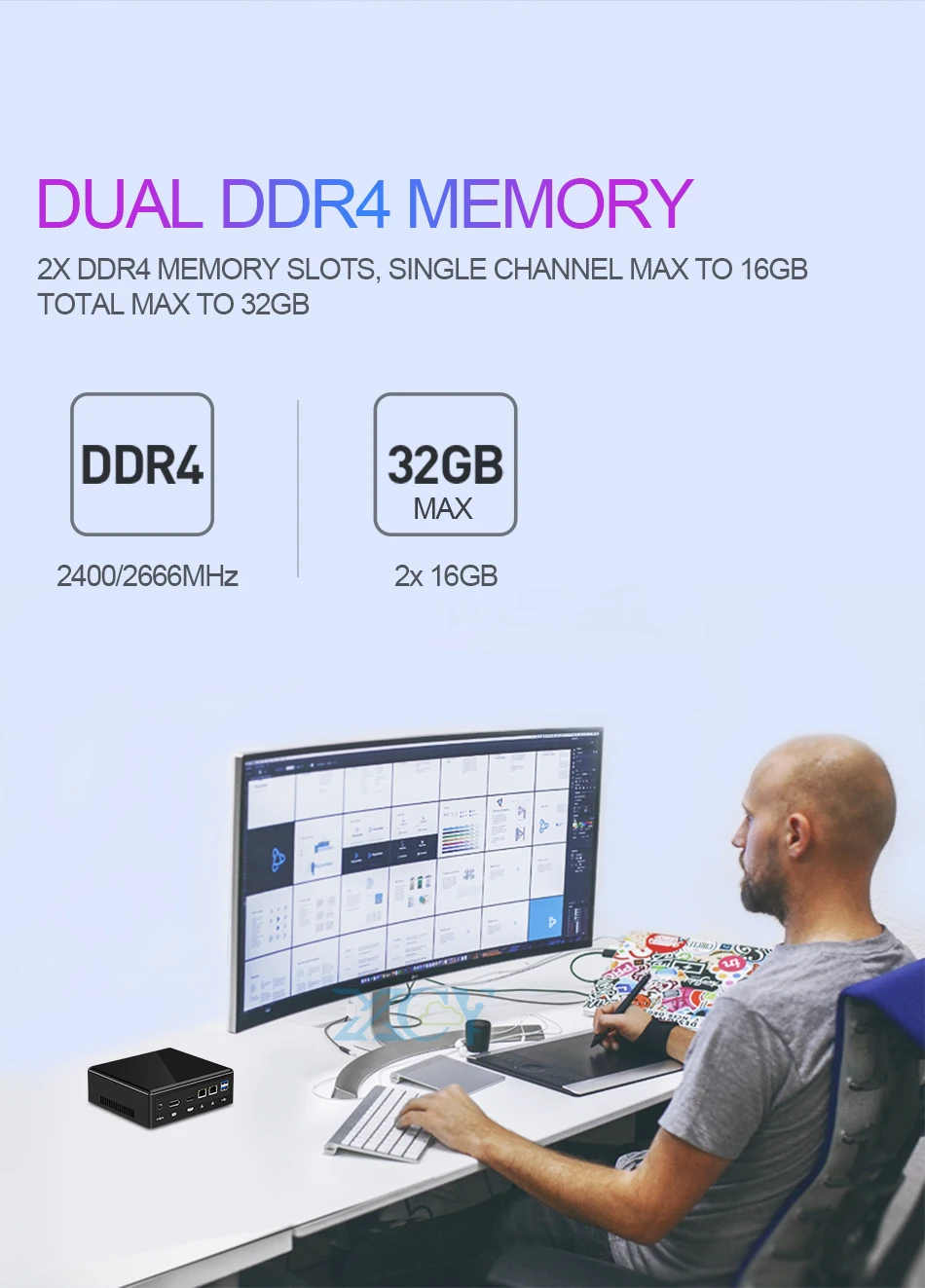 XCY X41 Mini PC Intel Core i3 i5 i7 Processors Inside, 2x DDR4 memory slots, M.2 NVMe SSD hard drive, 8x USB, Type-C, HDMI & DP, 4K 60fps, 2.4G/5.0G Dual-band WiFi, Support Windows 10/ Linux /Ubuntu OS