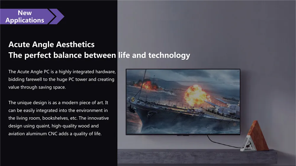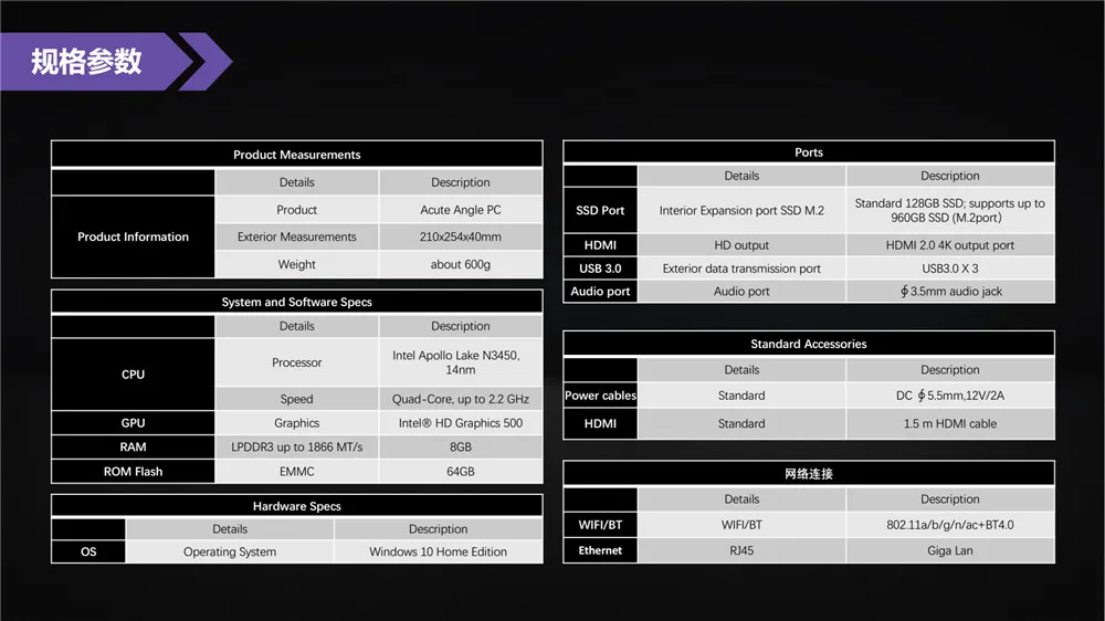 | Acute Angle Triangular Mini PC Intel Apollo lake Celeron N3450 8GB RAM 64GB EMMC+128GB SSD 2.4G&5G WiFi Wifi Bluetooth RJ45 Port |