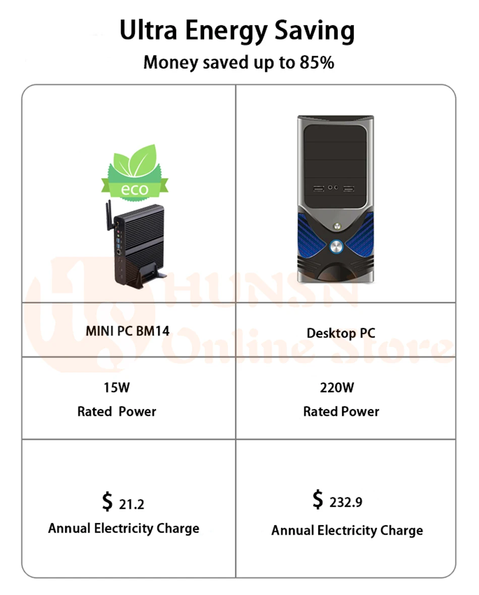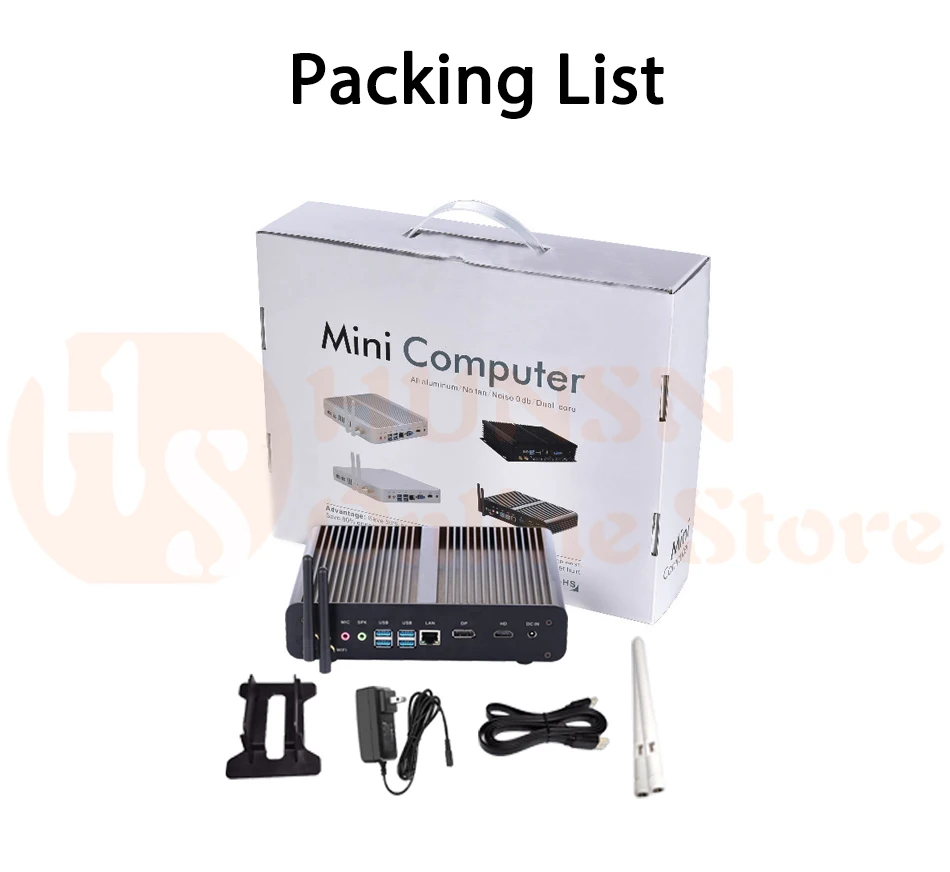 Packing List: HUNSN BM14L Mini PC+ Power supply+ Power Cord+ Vertical stand+ WiFi antennas+ Warranty Card