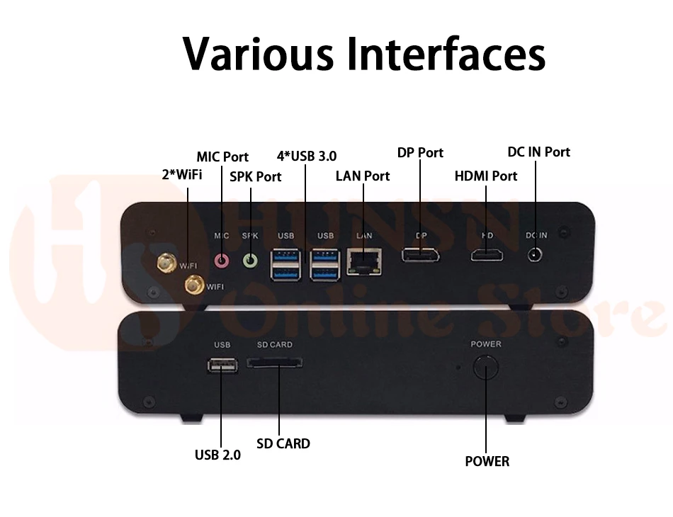- HUNSN BM14L designed with dp+ hdmi+ 4*usb 3.0+ 4*usb2.0+ lan+ spk+ mic, industrial aesthetic design and reasonable interface layout. support automatically power on after power failure, size at 225*185*45mm, 2.5kgs,12V5a power supply, with power cord, all use big brand memory and ssd/hdd with quality assurance. Very powerful fanless mini pc.