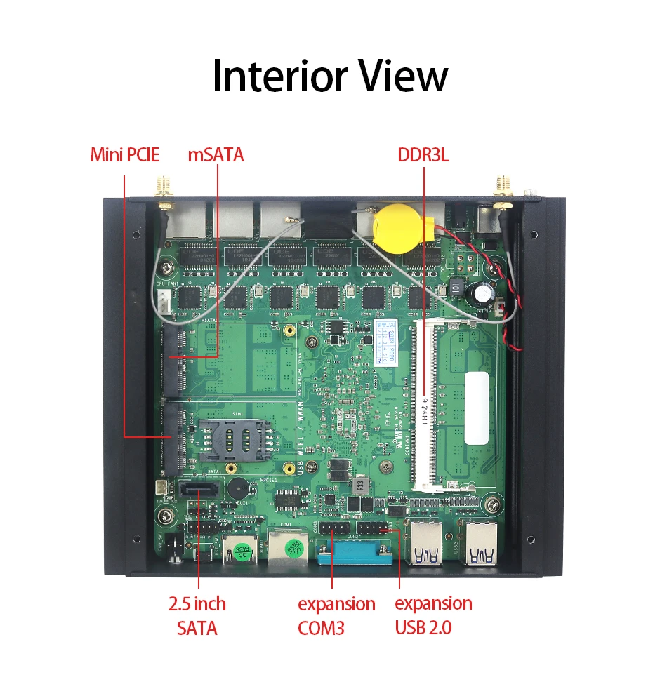 1. Compatible with 1 slot DDR3L 1.35V memory, max to 8GB2. Support 2.5 inch HDD + mSATA3. 6* Intel i210AT Gigabit Ethernet Controller4. Fanless passive cooling with on-board aluminum radiator5. Support virtualization, wake-on LAN, automatically power on function.6. It can setting Power-on after the power failure by BIOS.7. 6*LAN 2*COM 4*USB HDMI WIFI, DC INBuyer Reading: