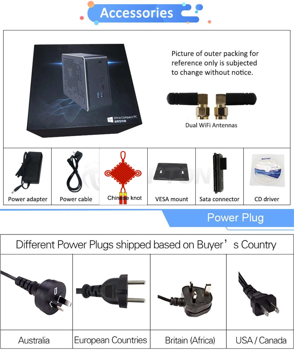 Big Sale for bundle with ram and storage: 1. FREE GIFT VESA Bracket&Mini PC remote control! 2. Upgrade DDR4 ram to 2666MHz free! 3. Upgrade strong signal AC WiFi+Bluetooth free! 4. Upgrade M.2 SATA SSD to fast M.2 NVME/PCIE3.0x4 SSD free! Product Highlight - Onboard Intel Coffee Lake 10th/9th/8th generation powerful processor for online games. - 2xSODIMM DDR4 memory slot up to 64GB more powerful performance improve work efficiency and give you a smooth experience. - Support HDMI2.0 and DP for dual 4K@60Hz display output synchronously, support HDR. - Support 2*M.2 2280 NVME/PCIE3.0x4 SSD+1*2.5'' SATA HDD/SSD. - Support 2*Intel Gigabit RJ45 Lans+M.2 2230 2.4G/5G Dual band AC(AX) WiFi/Bluetooth - Brushed Aluminum Alloy Black color shell, Exquisite production craft on outside design. - Support PXE, AWAL, RTC, Auto power on. Processor parameter for referance only . 8th Gen 14nm CPU Coffee Lake Intel Core i7 8750H 6 cores 12 threads 2.2GHz up to 4.1GHz 9MB cache TDP 45W UHD Graphics 630. 2. 8th Gen 14nm CPU Coffee Lake Intel Core i7 8850H 6 cores 12 threads 2.6GHz up to 4.3GHz 9MB cache TDP 45W UHD Graphics 630. 3. 8th Gen 14nm CPU Coffee Lake Intel Xeon E-2176M 6 cores 12 threads 2.7GHz up to 4.4GHz 12MB cache TDP 45W UHD Graphics P630. 4. 8th Gen 14nm CPU Coffee Lake Intel Xeon E-2186M 6 cores 12 threads 2.9GHz up to 4.8GHz 12MB cache TDP 45W UHD Graphics P630. 5. 8th Gen 14nm CPU Coffee Lake Intel Core i9-8950HK 6 cores 12 threads 2.9GHz up to 4.8GHz 12MB cache TDP 45W UHD Graphics 630. 6. 9th Gen 14nm CPU Coffee Lake Intel Core i5 9300H 4 cores 8 threads 2.4GHz up to 4.1GHz 8MB cache TDP 45W UHD Graphics 630. 7. 9th Gen 14nm CPU Coffee Lake Intel Core i7 9850H 6 cores 12 threads 2.6GHz up to 4.6GHz 12MB cache TDP 45W UHD Graphics 630. 8. 9th Gen 14nm CPU Coffee Lake Intel Core i9 9880H 8 cores 16 threads 2.3GHz up to 4.8GHz 16MB cache TDP 45W UHD Graphics 630. Barebone mini PC ( No RAM No Storage) package DO NOT include WiFi, if you need, please pay extra US $7 at this link. Accessories as Ram, SSD, HDD, we use famous brand:samsung, micron, SanDisk, toshiba, hynix, crucial, liteon, kingfast, phison etc, What brand we use depends on our test and our stock. 1. EXP GDC kit for connecting external dedicated GPU add extra 120$: 2. USB Infrared remote (can turn power off but not on) add extra cost US$14. 3. External USB DVD-ROM add extra cost $18. 4. USB 2.4GHz Air Keyboard& Mouse, add extra cost $20. 5. Genuine OEM license sticker cost 35$. 6. 500GB 2.5'' HDD add extra 50$, 1TB 2.5'' HDD add extra 65$, 2TB 2.5'' HDD add extra 100$. 7. Intel AX200 WiFi6 Bluetooth5.0 card add extra 40$. Uprading link: https://fr.aliexpress.com/item/1005001645834971.html (how many dollars to upgrade, pay how many pieces, US$1=1pcs, For example upgrade USB IR remote, pay 14pcs for US$14, remember to leave message noting which one you uprade for...) Buy with confidence! 3 Years long warranty!