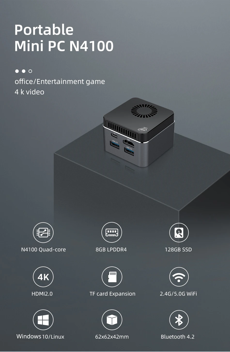 | Mini PC Intel Celeron N4100 Quad-Core 8GB LPDDR4 128GB 2.4G/5.0G WiFi Bluetooth 4.2 HDMI2.0 4K 60Hz USB-C Windows 10 |