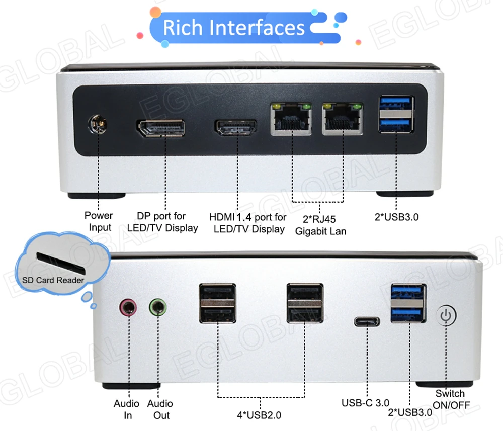 - Rich interfaces with USB, Type-C, SD Card, DP, HDMI, 2*LAN, etc to connect with more devices.
