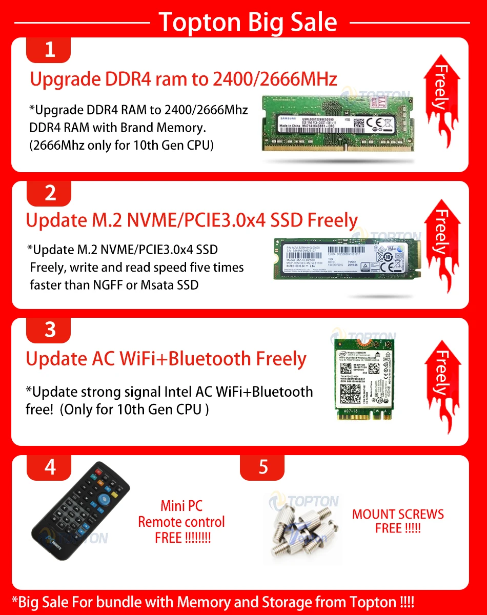 Intel Core i7-10510U, 8M cache, 1.80GHz up to 4.9GHz, 4 cores, 8 threads. Memory: Upgrade DDR4 ram to 2400MHz free! Install one ram stick and leave the other ram socket free for you to upgrade in future! Storage: Upgrade fast M.2 NVMe/PCIe SSD free! Barebone Mini PC ("No Ram No HD No WiFi" bundle) package DO NOT include WiFi, if you need, please pay extra US $7 at this link. Other bundles include WiFi. PC had best to use Samsung, SKhynix, Micron etc original brand accessories, We DO NOT compensate for buyer's own ram and hard drive Product Highlight - Smart tiny case 137x150x50mm hold by a hand, powerful processor 8th Gen stronger performance. - 1*M.2 2280 NVMe/PCIe/SATA SSD up to 32Gbps. Free Operating System: Default installed our trial activated OEM windows 10 pro English for free, other languages can be selected among: Russian,Spanish,Portuguese,French,German,Arabic,Italian,Japanese,Turkish,Greek etc. Please inform us which language you want to install. Other systems we can install free are like Linux, Ubuntu, Openelec etc if you need. Seller is irresponsible and makes no compensation for trial OEM system. Accessories as Ram, SSD, HDD, we use famous brand:samsung, micron, SanDisk, toshiba, hynix, crucial, liteon, kingfast, phison etc, What brand we use depends on our test and our stock. 1. USB Infrared remote (can turn power off but not on) add extra cost US$14. 2. 300M WiFi uprade to 5GHz AC WiFi&bluetooth, only add extra cost US$5. 3. Bluetooth4.0 USB Dongle add extra cost US$5. 4. External USB DVD-ROM add extra cost $18, External USB Bluray DVD-ROM add extra cost $45. 5. USB 2.4GHz Air Keyboard& Mouse, add extra cost $20. 6. Genuine OEM windows license sticker add extra cost 35$. 7. 500GB 2.5'' HDD add extra 50$, 1TB 2.5'' HDD add extra 65$, 2TB 2.5'' HDD add extra 100$. Upgrading link: https://fr.aliexpress.com/item/1005001645834971.html (how many dollars to upgrade, pay how many pieces, US$1=1pcs, For example upgrade USB IR remote, pay 14pcs for US$14, remember to leave message noting which one you uprade for...)