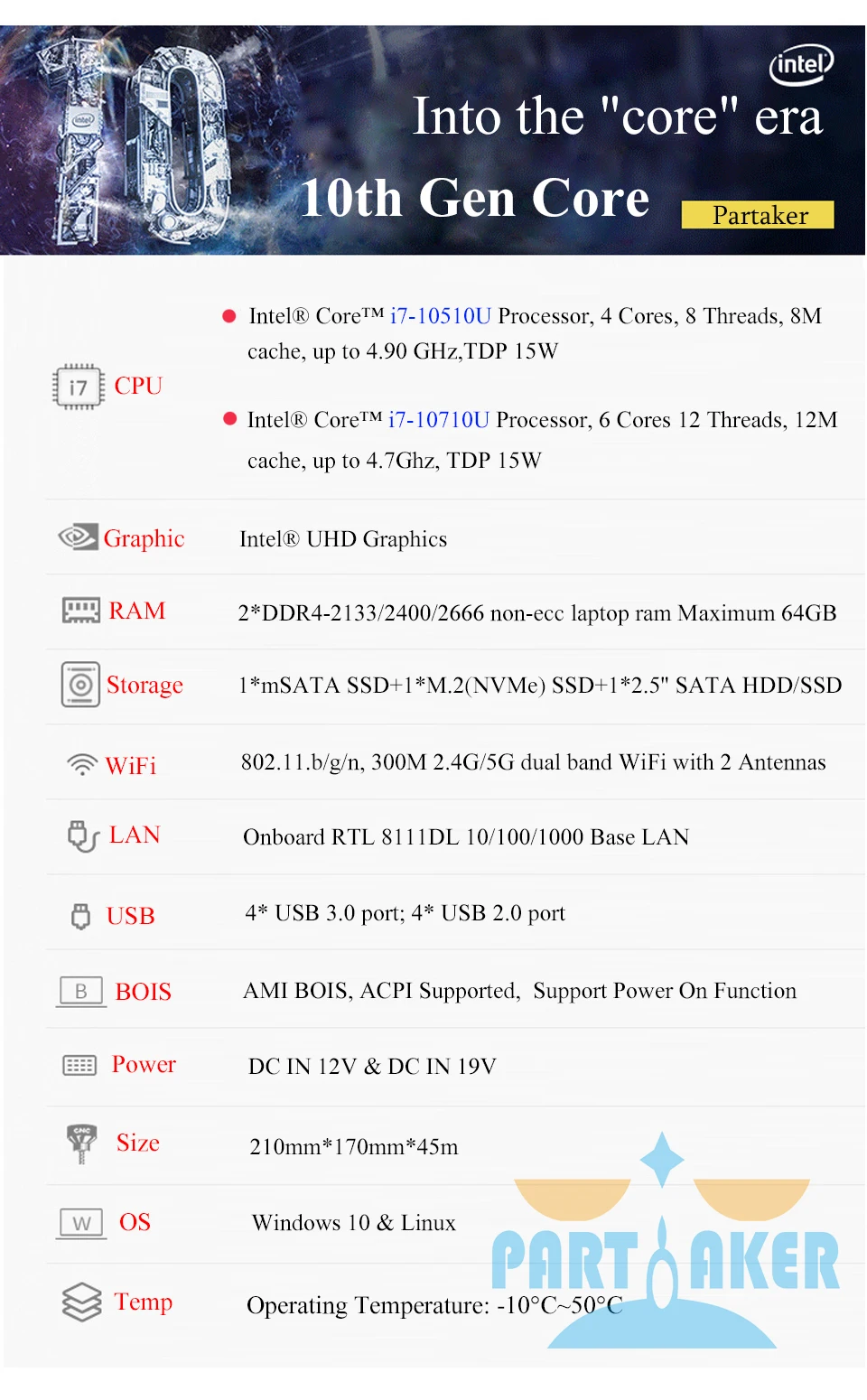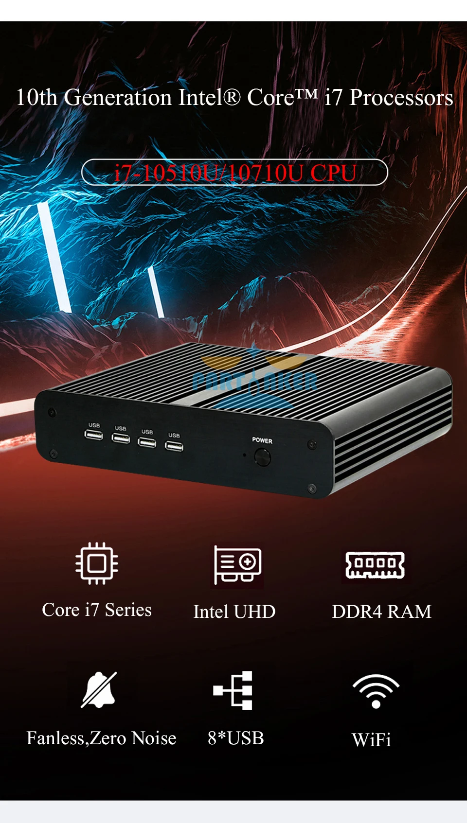 | Partaker Fanless Mini PC Intel Core i7 10710U 10510U Desktop PC Windows 10 2*DDR4 M.2 NVMe+Msata+2.5''SATA HTPC Nettop HDMI DP |