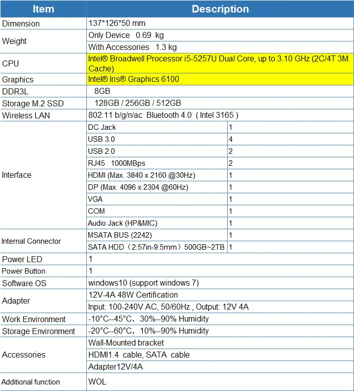 ● Intel core i5-5257U CPU, 2 core 4 threads,64 bit, 14nm 2.7GHz up to 3.1GHz,3M cache