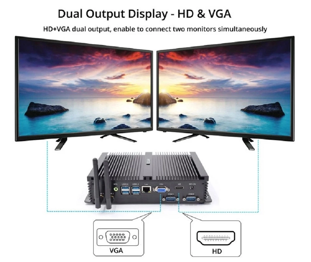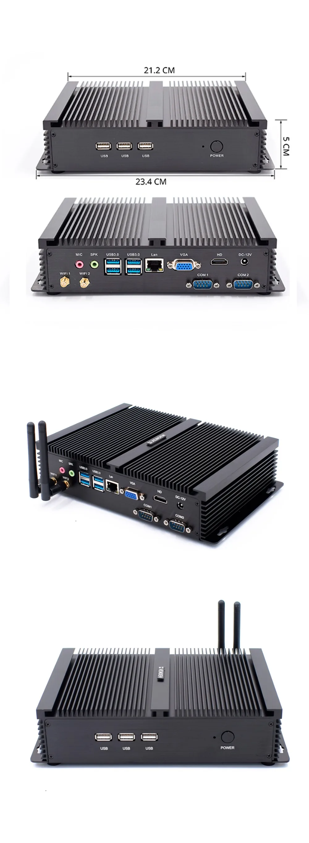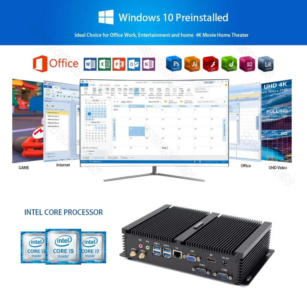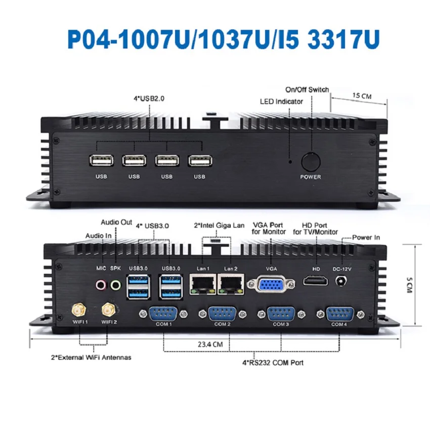 Processors Performance Core i3 4005U: 22 nmCPU Haswell 1.70 GHz 2 Core 4 thread Intel HD Graphics 4400 200 MHz-950 MHz Core i3 4200U: 22 nmCPU Haswell 1.70 GHz 2 Core 4 thread Intel HD Graphics 4400 200 MHz-950 MHz Core i7 4500U: 22 nmCPU Haswell 1.80 GHz-3.00 GHz 2 Core 4 thread Intel HD Graphics 4400 200 MHz- 1.10 GHz Core i3 5005U: 14 nmCPU Broadwell 2.00 GHz 2 Core 4 thread Intel HD Graphics 5500 300MHz-850GHz Core i5 5250U: 14 nmCPU Broadwell 1.60 GHz-2.70 GHz 2 Core 4 thread Intel HD Graphics 6000 300MHz-950GHz Core i3 7020U: 14nm CPU Kaby Lake 2.3GHz 2 Core 4 thread intel HD Graphics 620 300MHz-1GHz Core i5 8250U: 14nm CPU Kaby Lake R 1.6-3.4GHz 4 Core 8 thread intel UHD Graphics 620 300MHz-1.1GHz Features: 1. Support Windows 8/10, Linux, Ubuntu OS, and more; 2. Support two hard disk, one mSATA SSD and one 2.5 inch HDD/SSD, and we free send 2.5 inch SATA cables; 3. Low power consumption only 15W, energy-saving up to 90% compare to traditional desktop computers; 4. Support Wake-on-LAN, Automatically power on when power failure, support virtualization. 5. Extensive connectivity, 1x Gigabit LAN, 2x RS232, 4x USB 3.0 ports , 3x USB2.0,Combo audio; 6. Support WiFi connected to network; 10. Aluminum case & Fanless passive cooling offer you zero noise experience. What In The Package 1x Mini PC 1x AC adapter ( we ship correct power plug base on buyer's address ) 1x Power cord 1x WiFi module and antennas ("NO SSD NO RAM" bundle package without WiFi module and antennas ) 1x SATA Power cable & data cable 1 x User manaul & warranty card Buyer's Guide 1) Buyer please select processor from " Color " option, and select memory capacity and hard drive capacity from " Bundle " option ; If you need other combination, please leave us message and we will offer quotation. 2) Windows7/8/10 English for free, other languages can be selected. Please inform us which language you want to install. Other systems we can install free are like Linux, XBMC(Kodi), Ubuntu, Openelec etc if you need. 3) Buyer select DHL/Fedex shipping method, should be sure your address is belong to normal delivery area, otherwise there will be extra cost for delivery, if your address is remote area, our salesman will inform you asap; or we will ship out by other shipping method; 4) All items price NOT include destination custom taxes and VAT. Specifications: 2. If you have special requirement of the value, please leave a message to us when you make order. 3. Due to the tax problem, buyer refuse to receive the goods, buyer need to responsible for the freight back and forth. Thank you for you cooperation.