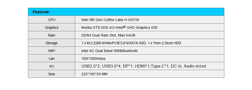 1. 9th Gen 14nm CPU Coffee Lake Intel Core i5-9300H 4 cores 8 threads 2.4GHz up to 4.1GHz 8MB cache TDP 45W UHD Graphics 630. 2. 9th Gen 14nm CPU Coffee Lake Intel Core i7-9750H 6 cores 12 threads 2.6GHz up to 4.5GHz 12MB cache TDP 45W UHD Graphics 630. 3. 9th Gen 14nm CPU Coffee Lake Intel Core i9 9880H 8 cores 16 threads 2.3GHz up to 4.8GHz 16MB cache TDP 45W UHD Graphics 630. 4. 9th Gen 14nm CPU Coffee Lake Intel Core i9 9980HK 8 cores 16 threads 2.4GHz up to 5.0GHz 16MB cache TDP 45W UHD Graphics 630. Memory: 2*DDR4 ram slots, max 64GB 2666/2400MHz Storage: 1*M.2 2280 SATA/NVME/PCIE3.0x4 SSD+1*2.5'' SATA Graphic card: Intel UHD Graphics 630+Nvidia GeForce GTX 1650 4GB GDDR5 Video ports: 1*HDMI 4K@30Hz+1*DP 4K@60Hz dual displays Network card: RTL8XXX series Gigabit Ethernet+M.2 2230 2.4G/5G Dual band AC WiFi/Bluetooth USB: 4*USB3.0+2*USB2.0+USB3.1 Type-C Shell: Dark gray color aluminum alloy Heat-sink: Full cooper turbo cooler Weight: Net 1.3kg, Gross 2.5kg Dimension: 222*195*39mm Power Supply: 19V 120W What's in the package 1xMini PC 1xPower supply 1xPower cable ( we ship correct power plug base on buyer's address ) 1xSATA power&data cables 2. External USB DVD-ROM add extra cost $18. 3. USB 2.4GHz Air Keyboard& Mouse, add extra cost $20. 4. Genuine license sticker add extra cost 35$. 5. 500GB 2.5'' HDD add extra 50$, 1TB 2.5'' HDD add extra 65$, 2TB 2.5'' HDD add extra 100$. 6. Intel AX200 WiFi6 Bluetooth5.1 card add extra 40$. Uprading link: https://www.aliexpress.com/item/32738298207.html (How many dollars to upgrade, pay how many pieces, US$1=1pcs, For example upgrade USB IR remote, pay 14pcs for US$14, remember to leave message noting which one you upgrade for...)
